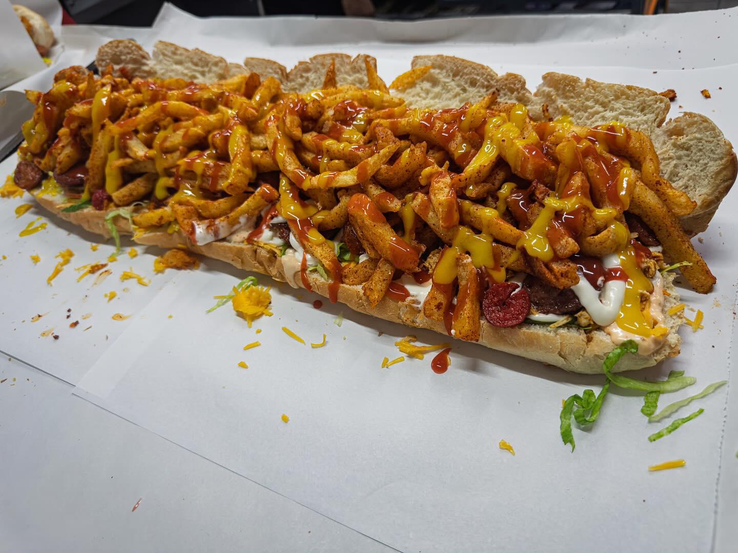 I’m Nick Hamman and this video is paying tribute to 3 South Africa fast food classics and if you know, you know and if you don’t know, its time to learn. I’m out at Akhalwayas on the M1 and we’re kicking it off with Joburg’s answer to the Gatsby, The AK. We’re talking a fresh footlong roll of white bread, spread open begging for a good filling. First, not one but two cups of cheddar cheese, then to keep things healthy we’ve got lettuce, red onion and tomato. Sauce, and lots of it, at least 3 different kinds. Next comes the meat, I’m doing half masala steak and half spiced chicken. Deep fried polony and Russian slices for good measure, then chips spiced with masala and salt all tucked neatly into classic paper waiting to be served.